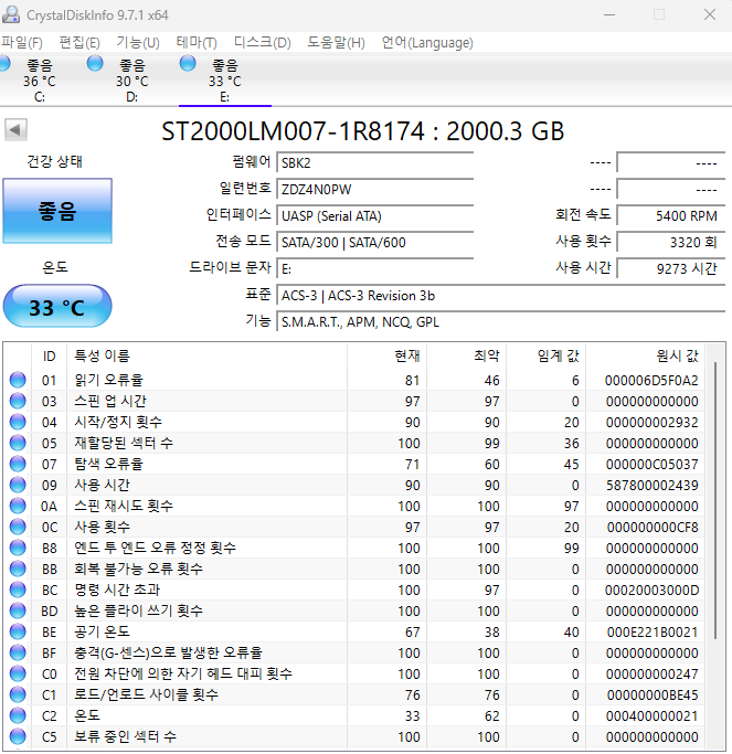 ์ด ์ธ์๋ **'์ฌ์ฉ ํ์', '์ฌ์ฉ ์๊ฐ'**์ ๋ณด๋ฉด ๋ด ์ปดํจํฐ๊ฐ ์ง๊ธ๊น์ง ์ผ๋ง๋ ์ด์ฌํ ์ผํ๋์ง ์ ์ ์๊ณ , **'์จ๋'**๋ฅผ ํตํด ํ์ฌ ํ๋๋์คํฌ๊ฐ ๋๋ฌด ๋จ๊ฒ์ง๋ ์์์ง ํ์ธํ ์ ์์ด.